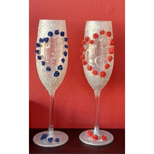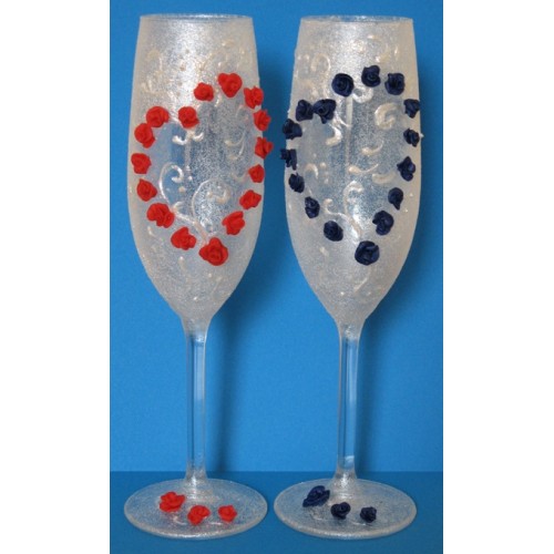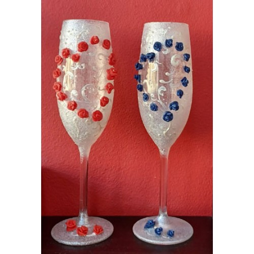 Pereche de pahare pentru șampanie. Model Inima din Trandafiri Alb & Albastru.