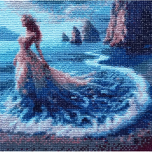 Adaugă eleganță și mister în decorul casei tale cu această lucrare deosebită realizată manual prin tehnica diamond painting. Tabloul ilustrează o figură feminină grațioasă, prinsă într-o mișcare fluidă, parcă născută din valurile oceanului, sub lumina argintie a lunii. Jocul de nuanțe reci – albastru, gri, bej – adaugă profunzime și calm, oferind o senzație de liniște și reverie.